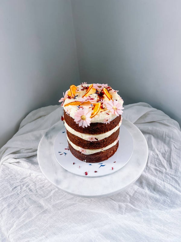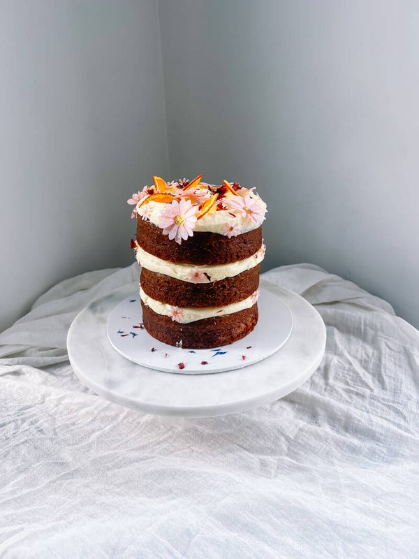 Luchtige carrotcake met creamcheese frosting, afgewerkt in lente thema.